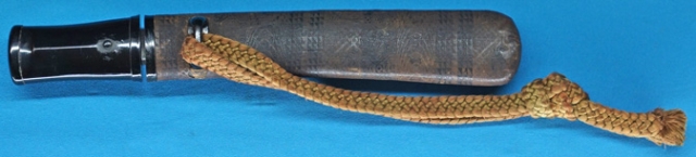 | #40 短刀 無銘 長さ 約21.5cm 反り 僅かに内反り 目釘穴 1個 鵜ノ首造り短刀で、庵棟です。小錆出てます。 板目詰んで、流れた地鉄に、 小沸出来の直刃を焼いています。 平成6年佐賀県登録。 錦包鞘合口拵/時代の傷み有ります。 元幅 約2.09cm 元重 約8.1mm 中心の長さ 約8.0cm 拵の寸法 柄 約8.3cm 鞘 約23.8cm 銀着せ一重ハバキ 小柄(割れています) 拡大画像はコチラ ![]() ![]() |